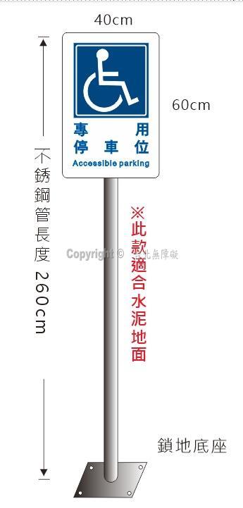 品名: 無障礙停車立柱牌(路邊用) 尺寸: 40×60cm 材質: 鋁合金板+不銹鋼管柱 備註: